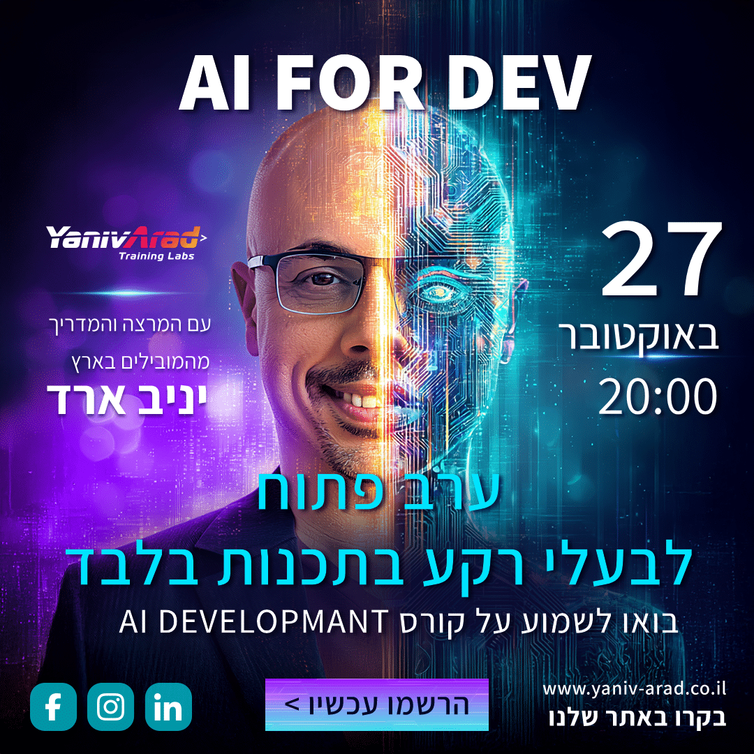 הצטרפו לערב פתוח לקורס AI למפתחים המתקדם בארץ, שהועבר בעשרות חברות הייטק בשנה האחרונה.